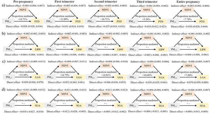 原文图3. 空气污染与不良出生结局之间关联中绿地暴露(NDVI 250 m)的中介分析