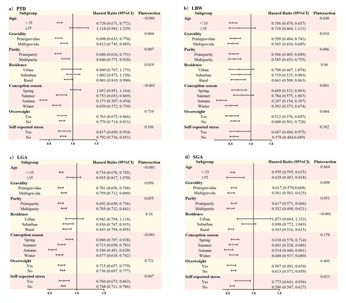 分层分析显示,在全孕期,仅在年龄<35岁、生活在农村地区、初孕和初产群体中发现绿地暴露与PTD之间的关联存在修饰效应。除此之外,在绿地暴露对LGA的影响中,自述无心理压力人群更能从接触绿地中获益。