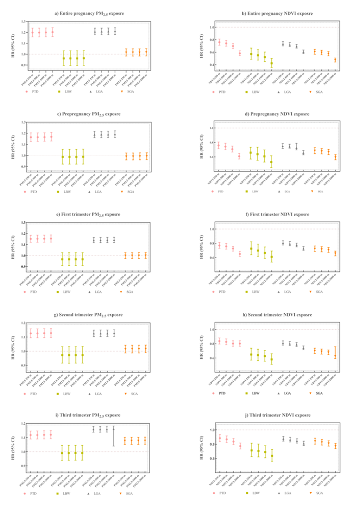 在250 m缓冲区,全孕期PM2.5浓度每增加10 μg/m³, PTD风险增加19.8% (HR:1.198, 95%CI: 1.158 ~ 1.239),LGA风险增加20.7% (HR:1.207, 95%CI: 1.177 ~ 1.239)。相反,绿地暴露与不良妊娠结局风险降低显著相关。全孕期NDVI每增加0.1个单位,PTD、LBW、LGA和SGA的风险分别降低24% (HR:0.760, 95%CI: 0.712-0.811)、43% (HR: 0.570, 95%CI: 0.488-0.666)、26.5% (HR:0.735, 95%CI: 0.702-0.770)、39.5% (HR:0.605, 95%CI: 0.568-0.646)。此外,在500m、1000m和2000m缓冲区内的绿地暴露也表现出相同趋势。