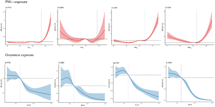 原文图2. 250 m缓冲区绿地暴露和空气污染与不良出生结局关联的暴露-反应曲线a)PM2.5-PTD b)PM2.5-LBW c)PM2.5-LGA d)PM2.5-SGA