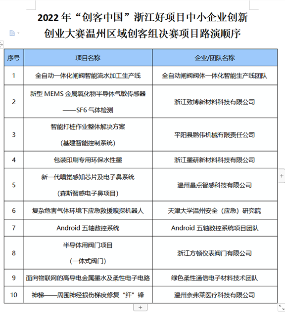 该赛事是由温州市经信局、温州市财政局、温州职业技术学院联合主办,温州市企业综合服务平台、中国中小企业国际合作协会温州办事处、世界温州人家园管理中心承办。本次决赛采取线下路演的形式,共设一等奖一名,二等奖二名,三等奖三名,经过前期申报评审,涵盖生命健康、智能制造、新材料、软件系统等产业领域的10个优秀项目被推荐参与决赛,充分展现温州各区域中小企业及创业团队的创新成果和“硬核”底色。