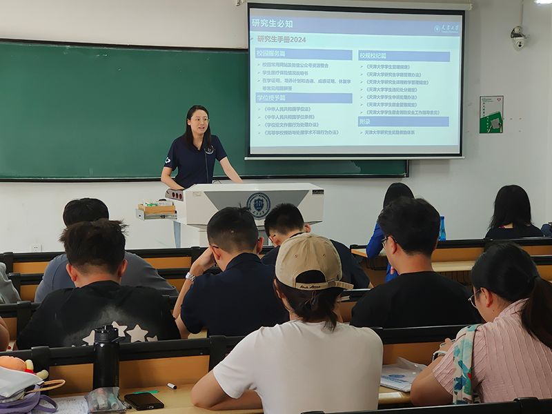 为提升研究生新生对天津大学的归属感,加强爱校荣校教育,学院党委副书记、副院长周艳热情欢迎新生们的到来,为大家介绍了天津大学近130周年的悠久历史,鼓励新生们涵养“天大品格”、努力完善自我,在天津大学求学、求知、求实、求是,开启人生新篇章。