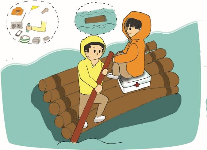 ● 在爬上木筏之前,一定要试试木筏能否漂浮,收集食品,发信号用具(如哨子、手电筒、旗子、彩色布条等)、划桨等。在离开房屋漂浮之前,一定要吃些食物和喝些热饮料来补充能量。