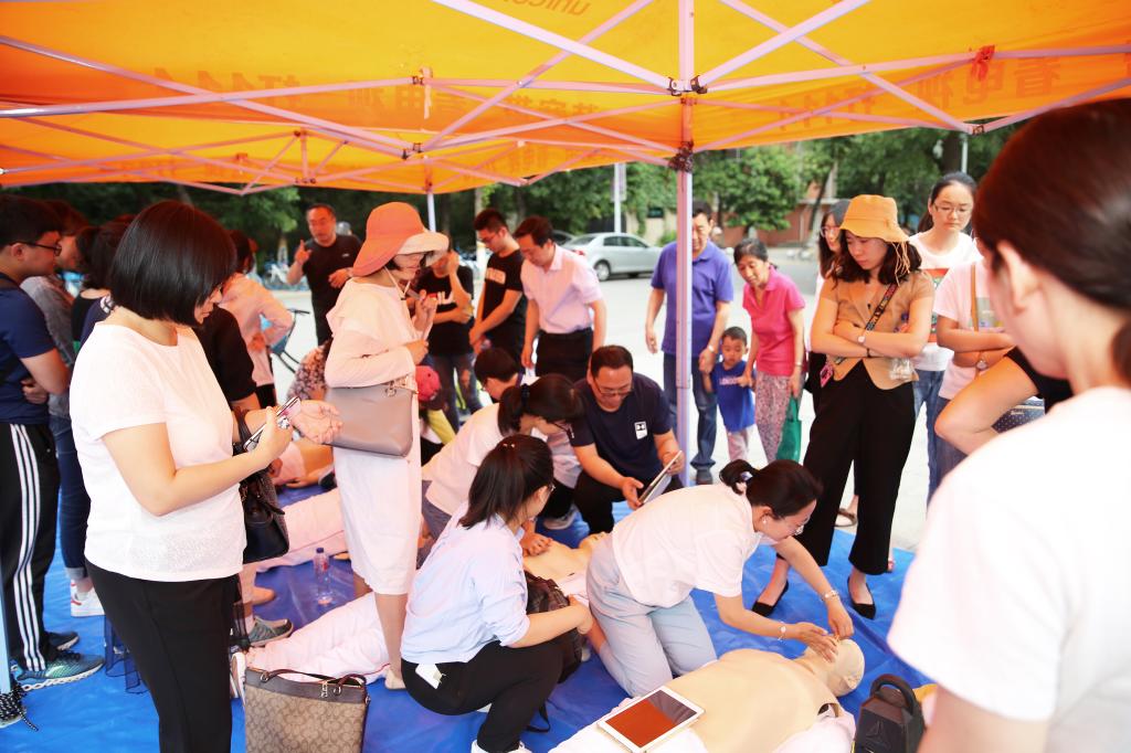 启动仪式结束后,灾难医学研究院培训部主任范斌带领专业培训人员为大家现场授课,众多参与者在模拟人身上进行了心肺复苏的互动体验。