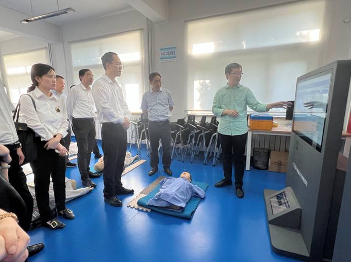 座谈前,范学序一行参观了天津大学药物科学与技术学院、应急医学研究院院实验室、培训演练室、学科建设展示室等。董文龙演示了人工智能心肺复苏培训考核机项目。