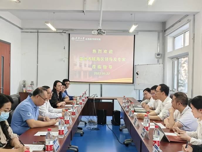 2023522日,浙江省温州市瓯海区委常委、组织部长、生命健康产业链链长范学序,瓯海区委组织部副部长陈翰博,瓯海区北京招商引智分中心常务副主任陈尔飞一行6人来访天津大学应急医学研究院(以下简称应急院),天津大学医学部党委书记李振宇、应急院常务副院长樊毫军参加座谈交流。座谈会由应急院副院长赵艳梅主持。