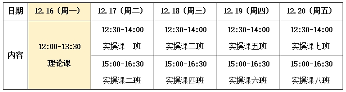 注:理论课需全体参加;实操课每人参加一次即可,无需重复报名。理论与实操均参加并考核通过后,方可申领证书。