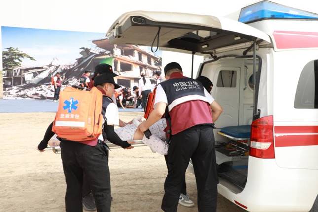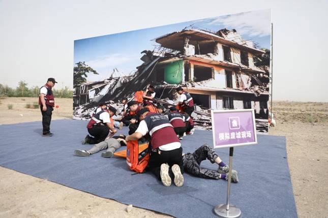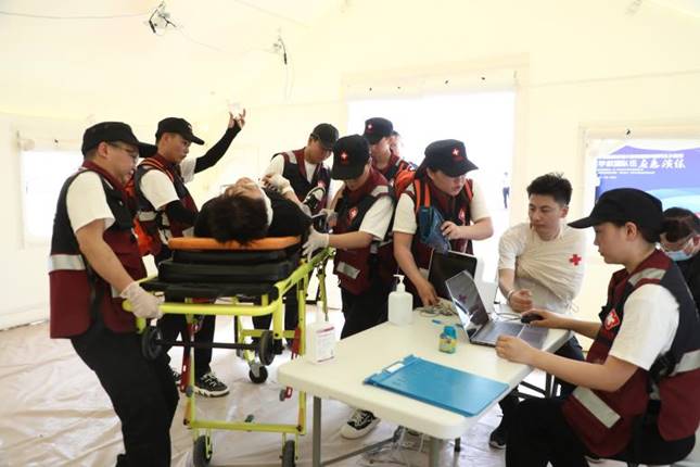 在演练环节,天津大学应急医学研究院培训中心团队全程指导,以进一步提高浙大邵逸夫阿拉尔医院紧急医学救援队伍应对突发事件应急能力,有力、有序、有效、有度的做好应对重大突发事件医疗应急工作为目标,队伍按照“全要素、全流程、实战化”要求,采取情景构建、贴近实战的方式,模拟某市发生 7.0 级特大地震,造成大量人员伤亡为背景,浙大邵逸夫阿拉尔医院紧急医学救援队伍立即响应市卫生健康委指令,派出队伍赶赴灾害现场,搭建移动医院并组织开展紧急医学救治工作,包括应急响应、机动开进、营地建设、检伤分类、现场急救转运、移动医院救治等环节,各环节有序展开,全体队员协同作战、密切配合,圆满完成了此次演练任务。