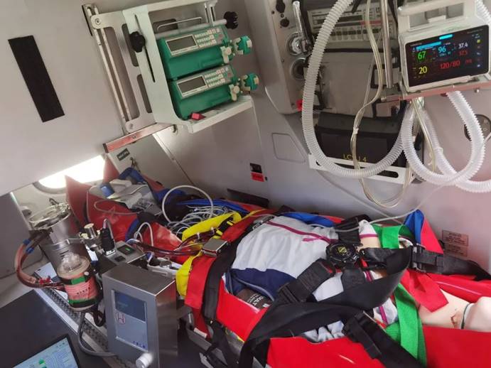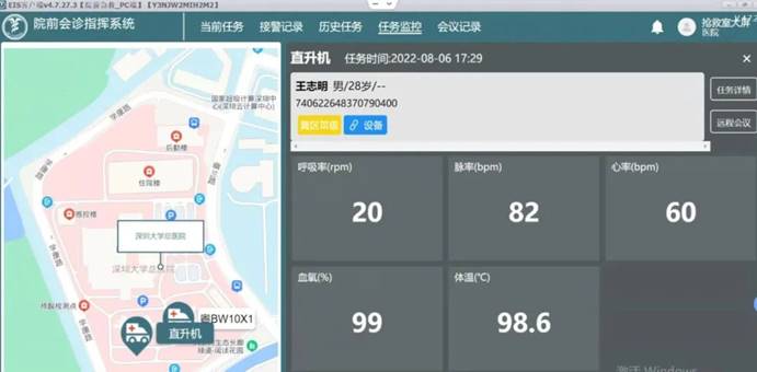 整个演练过程中,救援队利用5G技术将院内急诊与院外急救车、医疗救援直升机连接形成无缝衔接的整体,实现“上车/机即入院”及院前院内诊疗一体化。以陆面急救车、空中救援直升机为双载体,通过5G生命体征监测仪、5G便携式超声、车(机)载呼吸机以及车(机)载高清摄像头、4K大屏等先进设备应用贯穿急救前、急救中、急救后整个急救流程中。