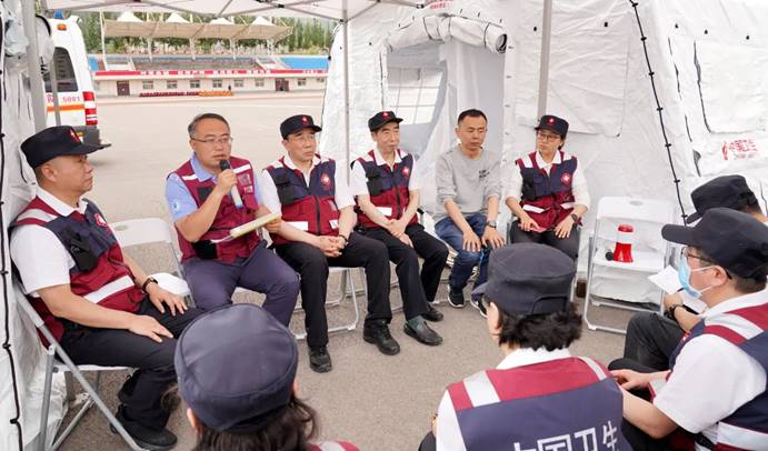 本次演练内容由灾难医学研究院培训中心团队进行了精心设计,以太原近郊发生地震为场景模拟,造成了大量人员伤亡,需进行紧急救援任务。此次演练包括应急响应、物资转运、机动开进、营地建设、搜索营救、医疗救援、撤收讲评等七个阶段。山西省人民医院党委书记陈利民作为总指挥宣布出队命令,医疗救援队长周芸副院长接到指令后迅速组织救援队到达指定地点,按照任务对预检分诊、快速处置、辅助检查、水电保障等各类功能区进行细化分工,营地选址、搭建帐篷医院、现场搜索营救、检伤分类、现场急救、帐篷医院救治、医疗后送等环节有序展开,全体队员认真对待、服从指挥,圆满完成了此次演练任务。