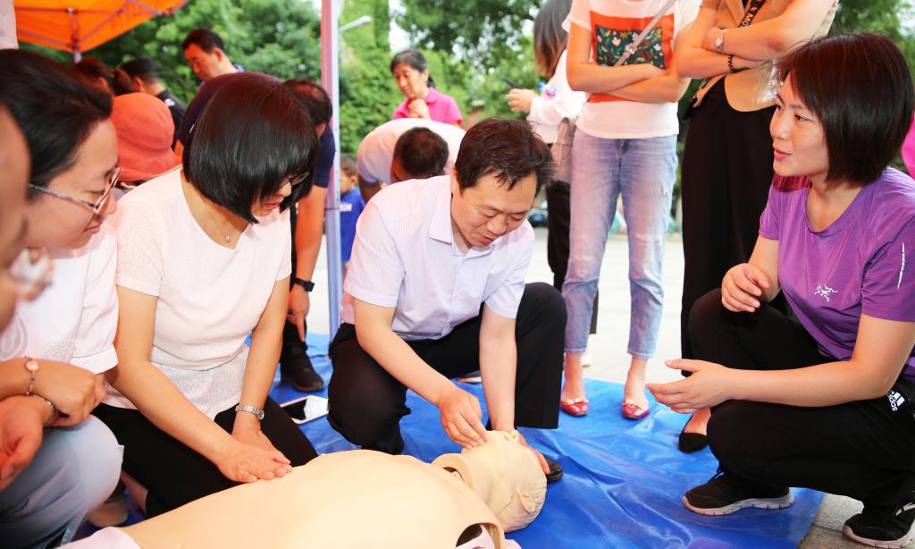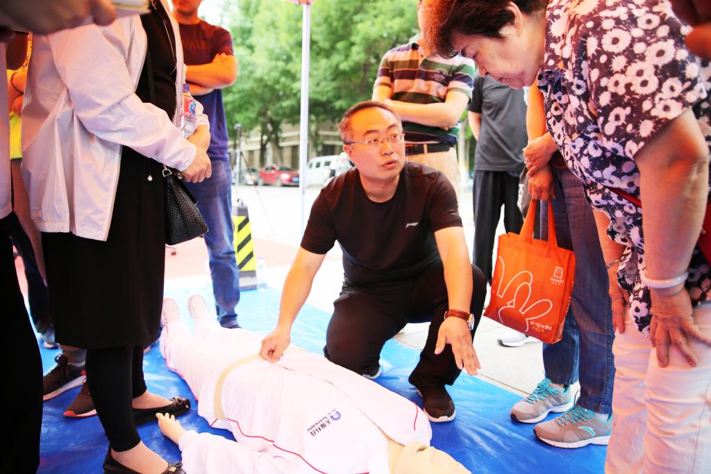 启动仪式结束后,灾难医学研究院培训部主任范斌带领专业培训人员为大家现场授课,众多参与者在模拟人身上进行了心肺复苏的互动体验。