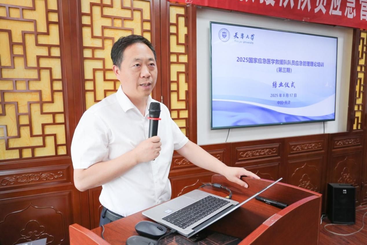 结业仪式上,天津大学卫生应急学院院长樊毫军首先发表致辞,他结合自身多年参与重大灾害救援的一线经验,生动讲述了在救援现场中,理论知识如何指导实战决策、实战经验又如何推动理论优化的真实案例,深刻强调理论与实践相辅相成、缺一不可。同时,樊毫军院长对本次培训课程的实施效果给予高度认可,指出课程既覆盖了应急医学核心理论,又贴合实战需求设计了多样化实践环节,真正实现了学用结合的培训目标;他还特别肯定了全体学员在培训期间的积极投入态度,对大家克服困难、认真学习、主动交流的精神表示赞赏。