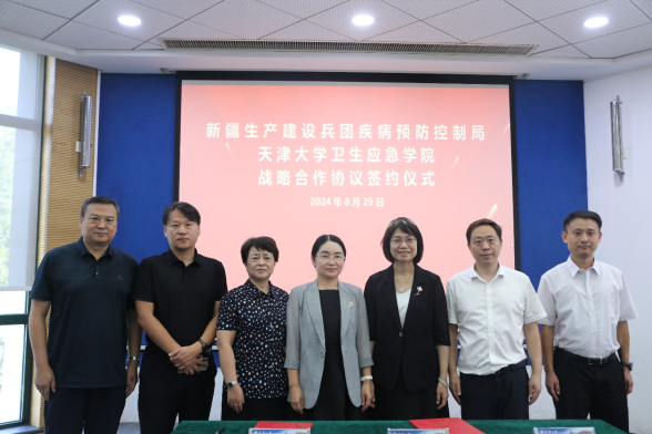8月29日,天津大学卫生应急学院与新疆生产建设兵团疾病预防控制局合作协议签约仪式成功举办。国家疾病预防控制局应急处置司副司长米燕平,新疆生产建设兵团卫生健康委员会党组成员、副主任及兵团疾控局党组书记、局长谢昕,天津市疾病预防控制局副局长杨光明,兵团疾控局应急处置处处长韦鹏军,中国疾病预防控制中心传染病所副所长张必科,天津大学党委副书记雷鸣,应急院班子成员出席签约仪式。仪式由卫生应急学院党委副书记、副院长周艳主持。