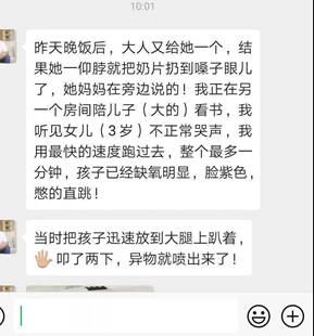 7月23日晚上,小思祺和往常一样在家里自己吃奶酥片,但是这一次,奶片却卡在了孩子的喉咙里。杨国涛听到孩子不正常的哭声,以最快的速度跑到孩子身边,仅仅过了不到一分钟,孩子已经明显缺氧,脸呈紫色,憋得直跳。孩子父亲临危不乱,运用培训课上学到的海姆立克急救法,让孩子趴在他腿上,叩打后背,孩子终于顺利地喷出了异物。如果当时没有在第一时间施救,或者施救方法不得当,单纯等待救护车的到来,后果将不堪设想!