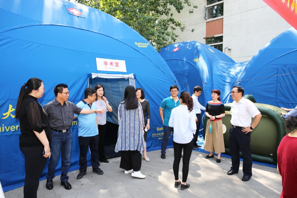 本次思迈防护向天津大学救援队捐献了价值200万元的救援装备,用于支持灾难医学学科建设、科学研究、执行救援任务等。仪式现场搭建起了由思迈防护生产的具有高原增压特性的专业帐篷,与会人员对帐篷的性能做了详细了解。