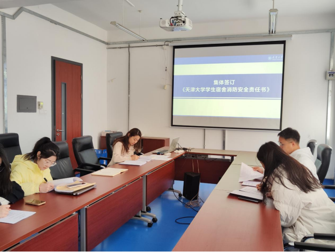 师生集体签订《天津大学学生宿舍消防安全责任书》。